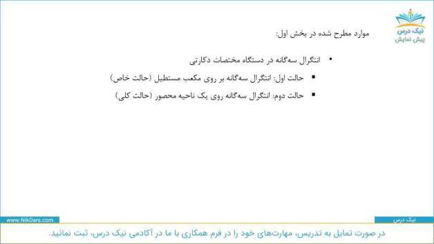 در این فصل، با بیانی بسیار ساده، طریقه محاسبه انتگرال سهگانه را آموزش میدهیم.